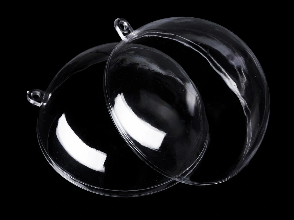 Průhledná plastová koule se skládá ze dvou částí, které se spojí a pomocí očka ji můžete pověsit jako dekoraci. Jedná se o polotovar, který je určen k dozdobení např. jej můžete obháčkovat, dekorovat metodou quilling, ubrouskovou technikou, dozdobit glitry atd.