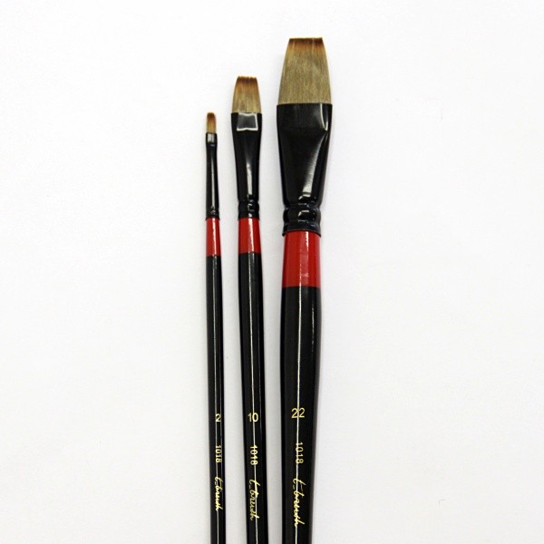 Štětec plochý. Vlas je syntetický a štětec je vhodný pro malování olejem a akrylem. Rukojeť je dlouhá dřevěná. Plochým štětcem lze malovat na plocho nebo jen hranou pro tenké linky.
