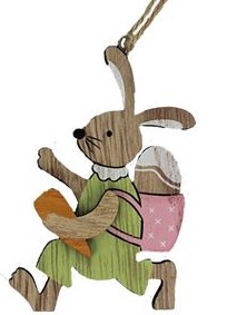 Zajíček + mrkev má šířku 4,5 - 5 cm, tloušťku 0,8 cm, výšku 7,5 cm. Barva : kombinace přírodní se zelenou a růžovou. Materiál na bázi dřeva.