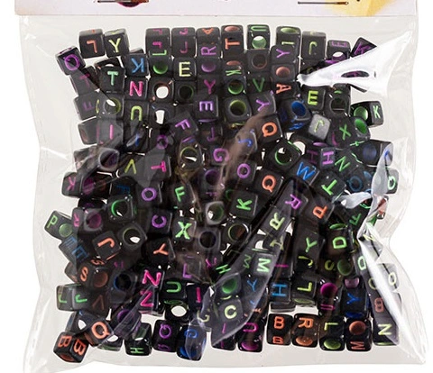 Plastové korálky s písmenky abeceda, cca300ks, 6 mm, černé s neonovými písmeny