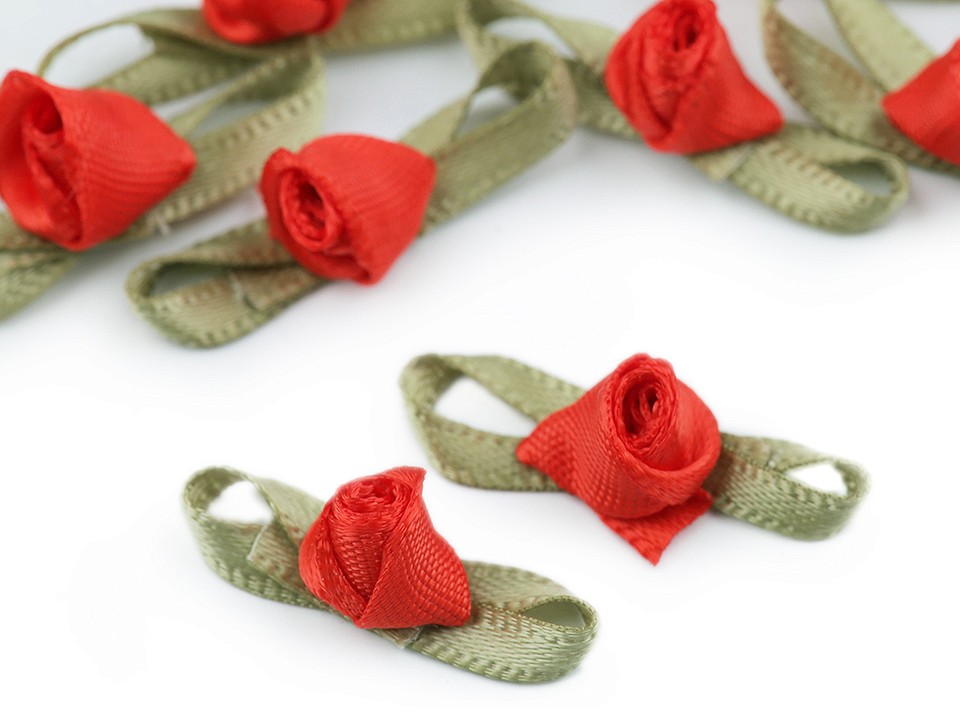 Malé textilní růžičky s lístky jsou vyrobené z jemně lesklé saténové stužky. Hodí se k přišití i k nalepení.