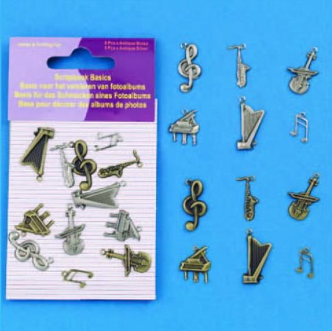 Přívěšky celkem 12ks Hudební nástroje ..6x antiq mosaz + 6x platina...přívěšky nebo doplňky pro scrapbook