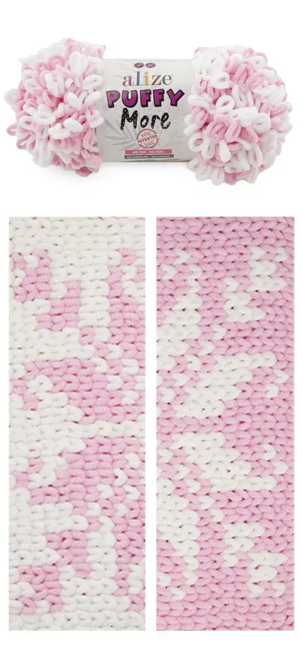 Dvoubarevná příze Puffy More je měkká, chlupatá žinylková příze s velkými očky. Na pletení nepotřebujete jehlice ani háček - proplétají se jednotlivá očka. Je vhodná na pletení dek, šálů apod.