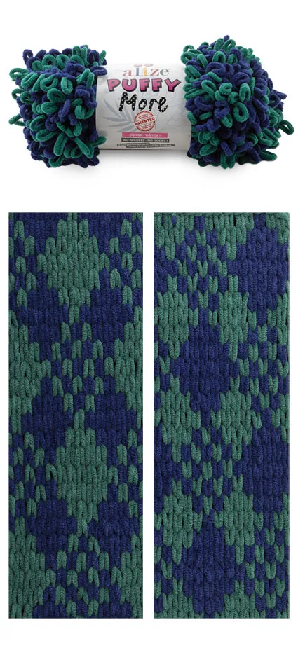 Dvoubarevná příze Puffy More je měkká, chlupatá žinylková příze s velkými očky. Na pletení nepotřebujete jehlice ani háček - proplétají se jednotlivá očka. Je vhodná na pletení dek, šálů apod.
